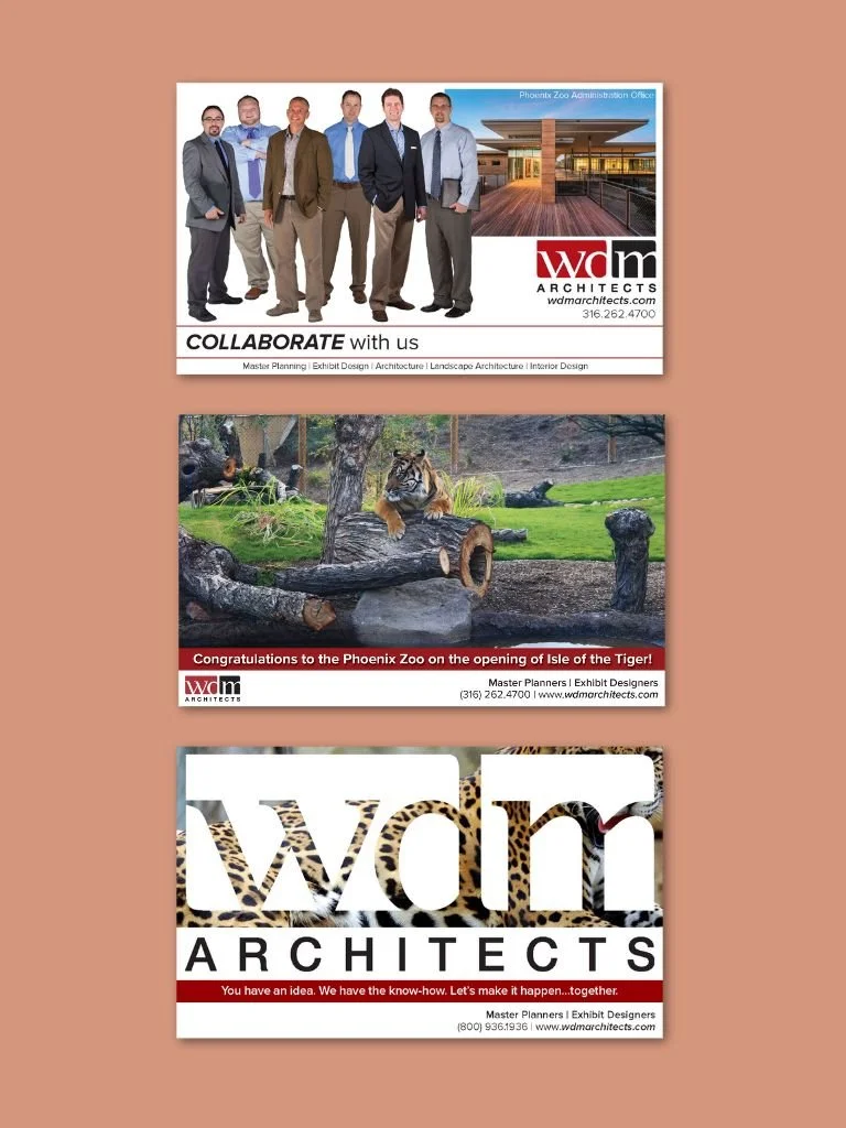 This company wanted to try a variety of approaches during their one-year ad agreement. Ads announced and congratulated clients on new openings, focused on the personal aspect of architecture services, or featured a hide-and-seek element behind a large logo.