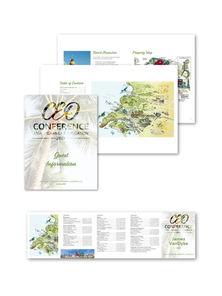 This company was responsible for hosting a conference and required a wire-bound booklet detailing the schedule, venue amenities, breakout session data, and contact information. A lanyard insert complimented the booklet as a hands-free directory.