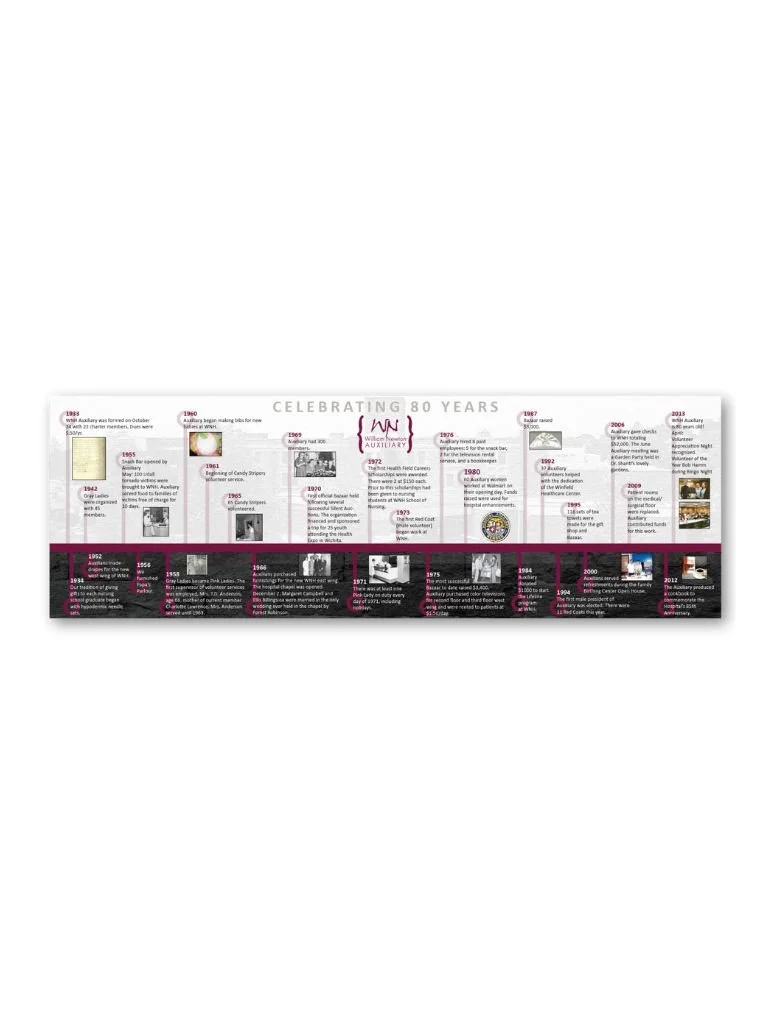 This hospital’s auxiliary organization celebrated 80 years by commissioning a large timeline honoring their legacy. The final piece measured 84 x 28 inches and hung at their desk in the hospital’s entryway.
